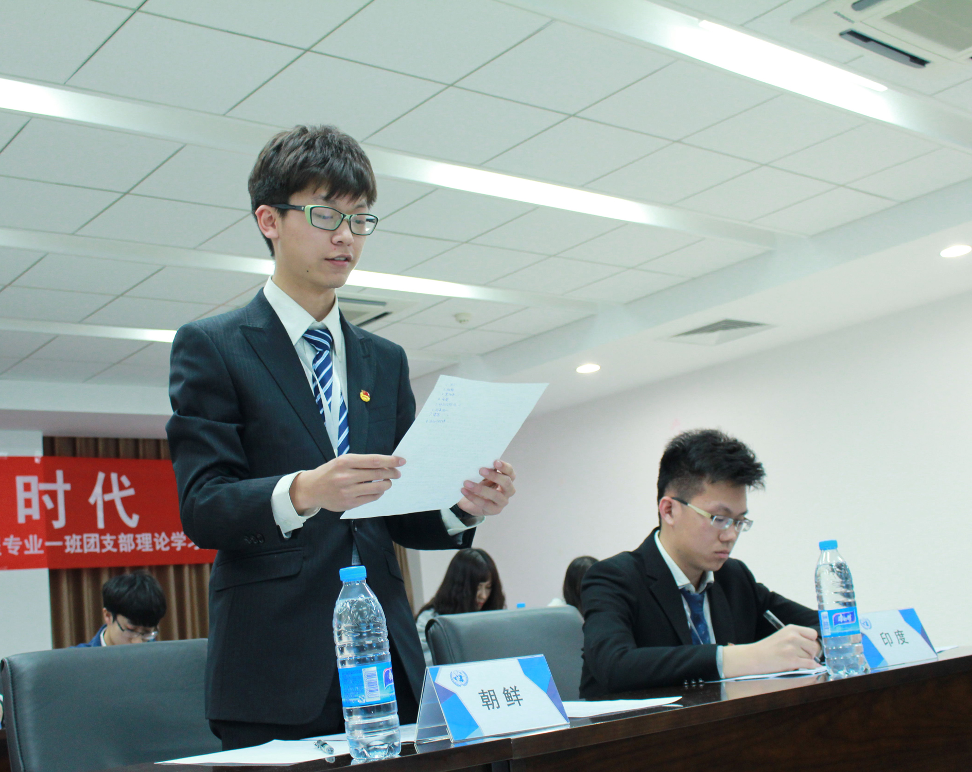 本次理论学习开展了以“是否应该共建世界互联网产业同盟”为议题的模拟联合国活动。在模联活动中,同学们身着正装,注意力集中,有条不紊地发表着所代表的国家的看法,并对相关的议题进行了热烈讨论。yl88858永利官网经理张玉志及辅导员还通过视频为同学们解答了“互联网+”相关问题,使同学们对本次模联的议题有了更深入的思考。